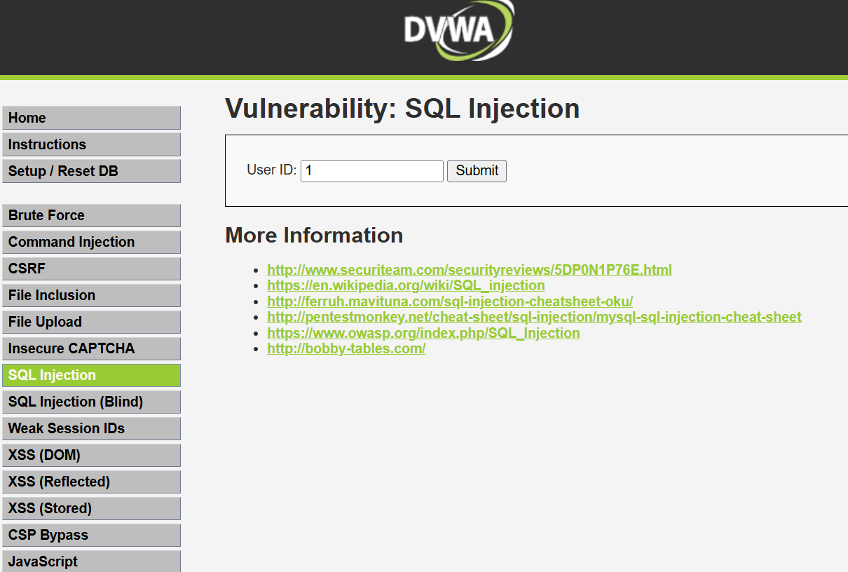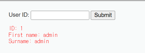 DVWA 에 접속한 상태에서 좌측 메뉴 중 SQL Injection을 클릭한다. 우측에 나타난 User ID 입력 칸에 숫자 1을 입력한 후 User ID 기반 조회를 위해 Submit 버튼을 클릭한다.