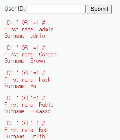 User ID 입력칸에 숫자 대신 위와 같은 ' OR 1=1 #라는 SQL Injection 코드를 입력한 후 Submit 버튼을 클릭한다.