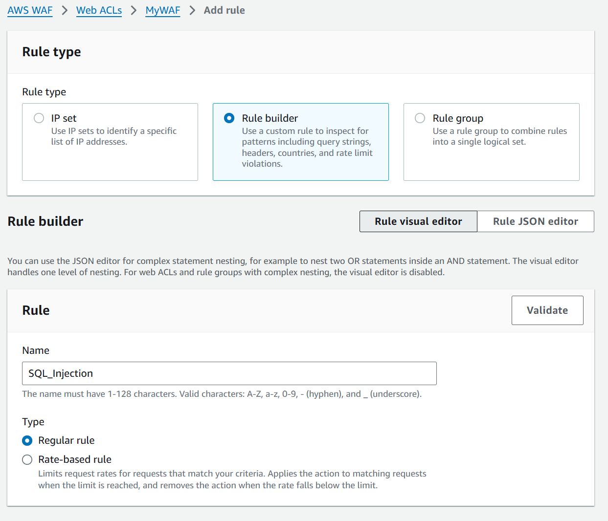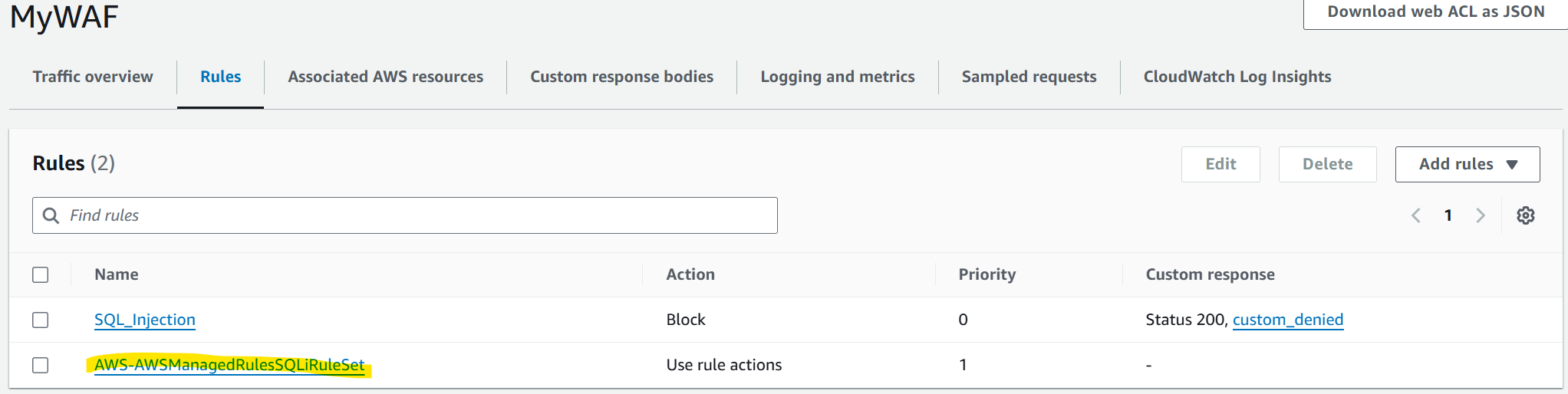 아래 그림과 같이 AWS-AWSManagedRulesSQLiRuleSet 규칙이 정상적으로 생성된 것을 확인할 수 있다.