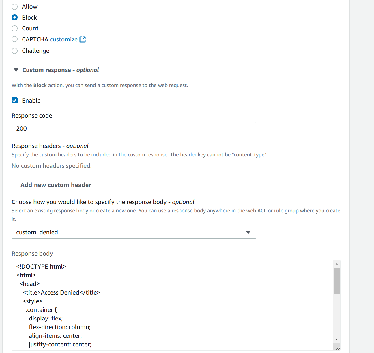 위의 자료를 참고하여 custom_denied라는 새로운 사용자 정의 응답페이지를 생성해준다.